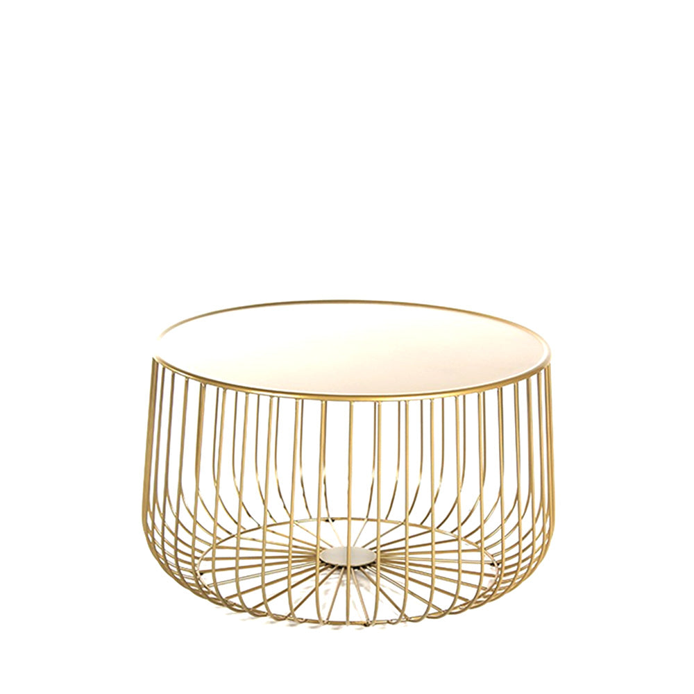 Esta mesa de centro o auxiliar, con su estructura de jaula dorada y su tapa clara, irradia un estilo glam y contemporáneo, con un toque bohemio-chic. Su diseño abierto y ligero le da una versatilidad increíble para cualquier espacio.